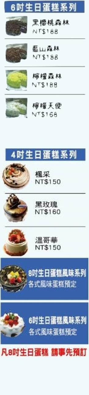 各式口味6吋、8吋生日蛋糕。注意事項:8吋蛋糕需事先預定!